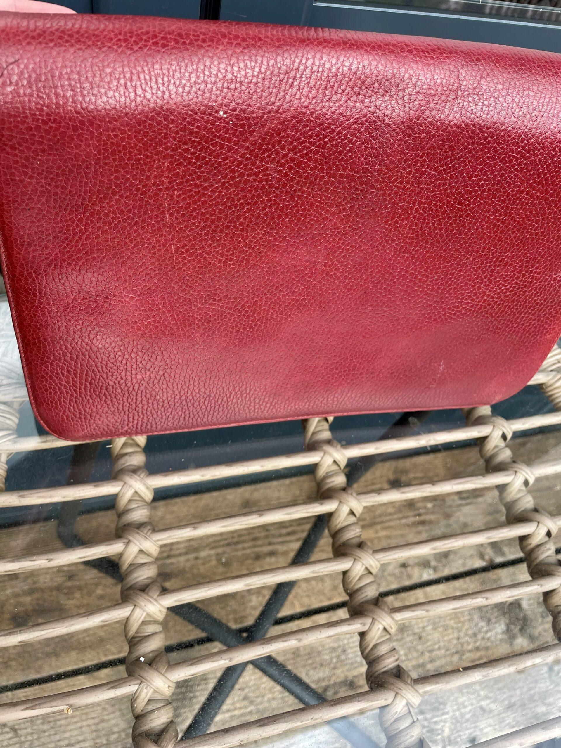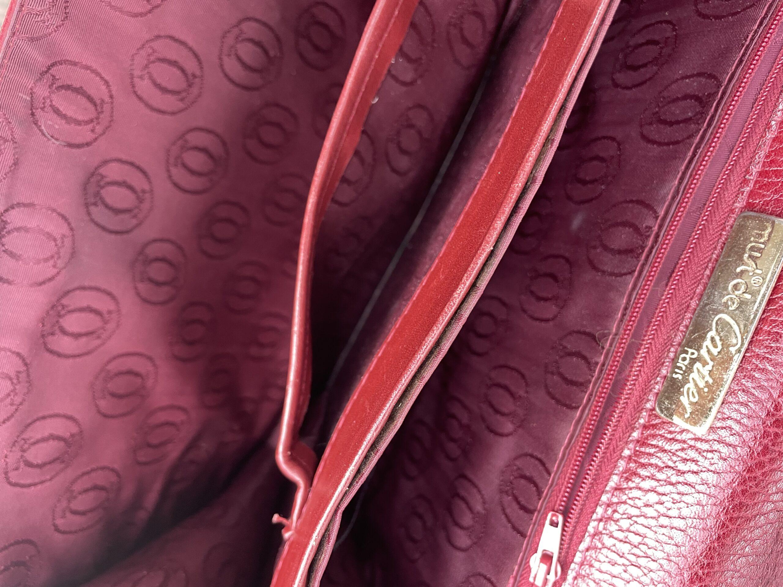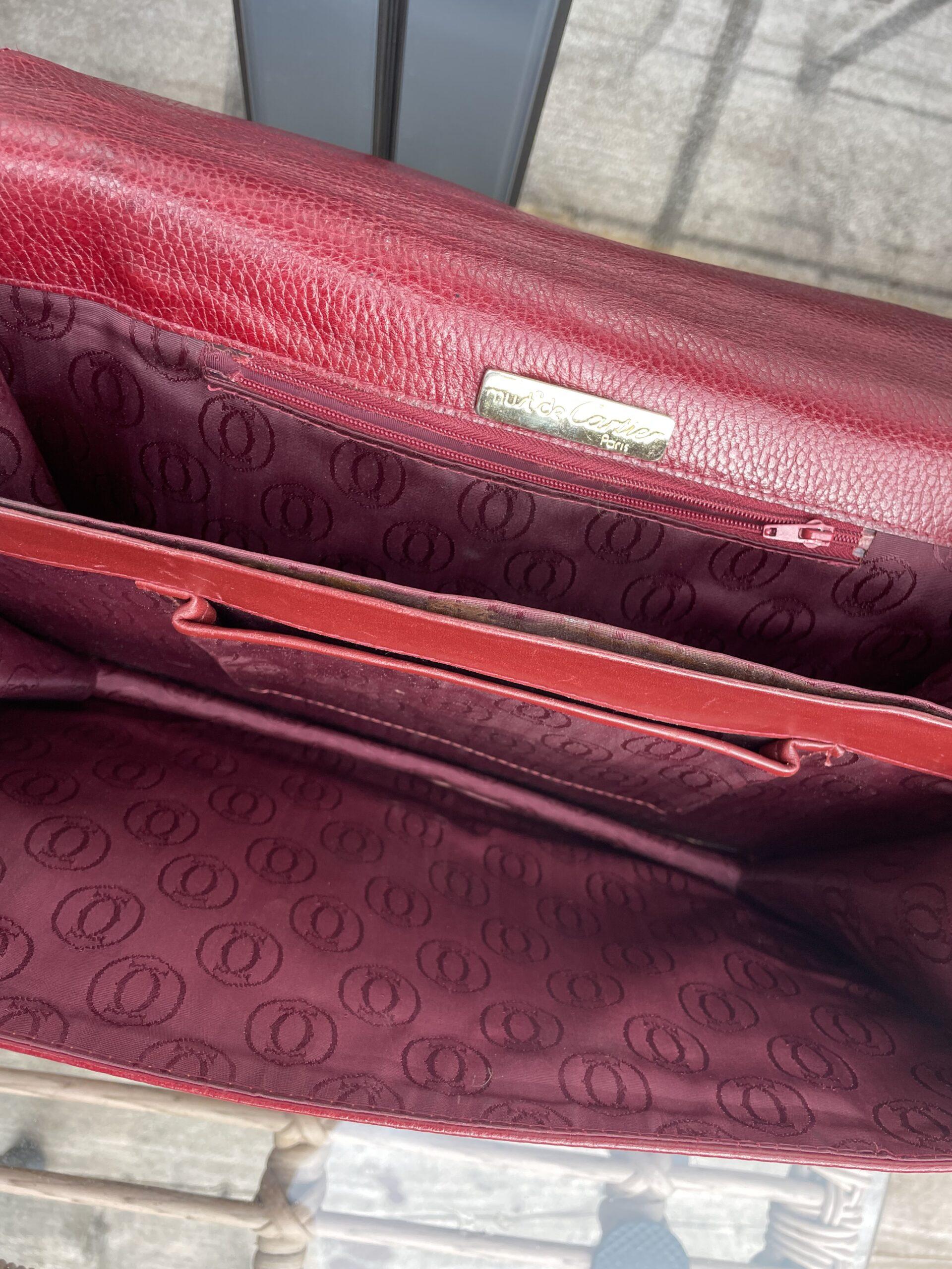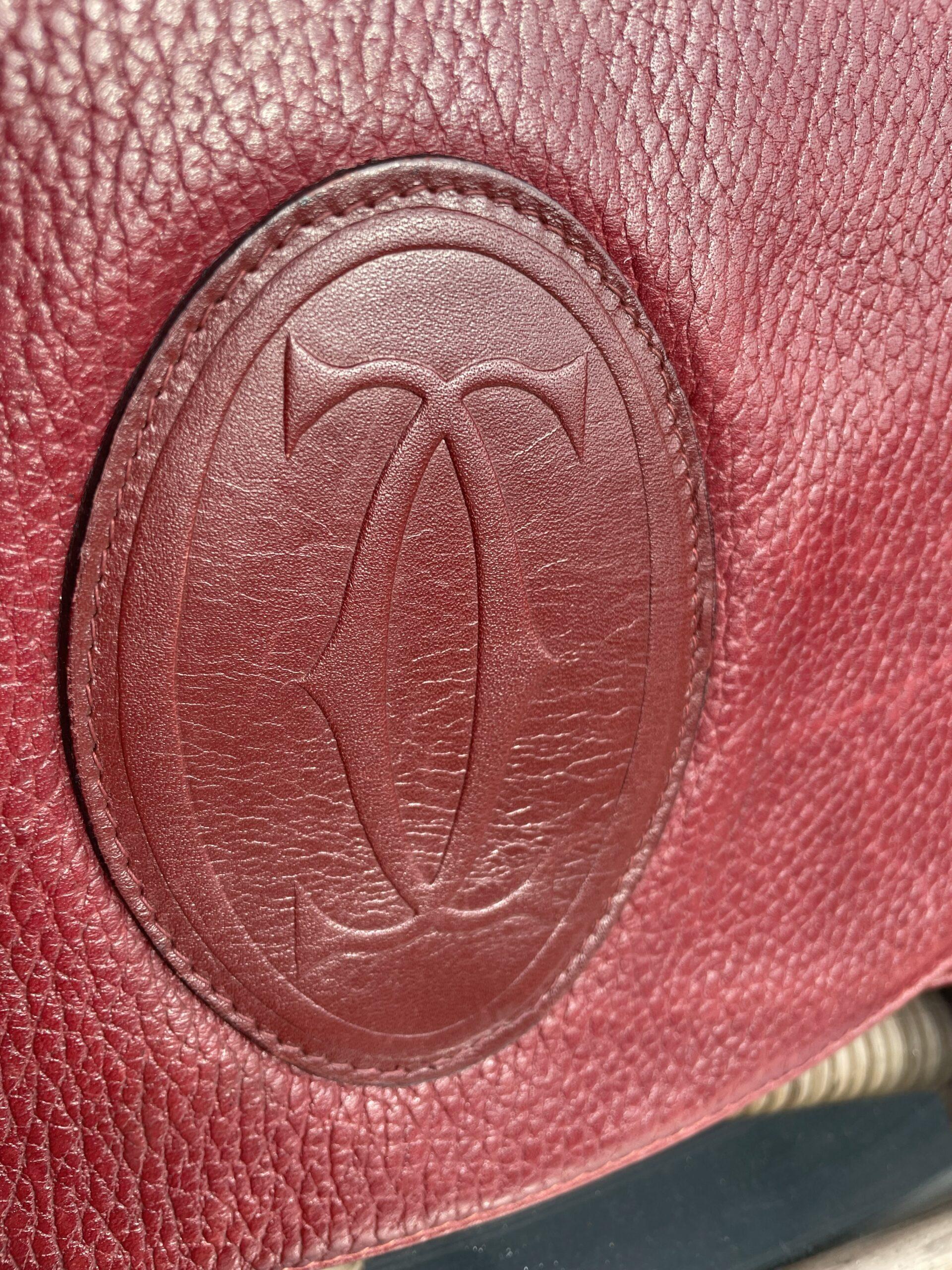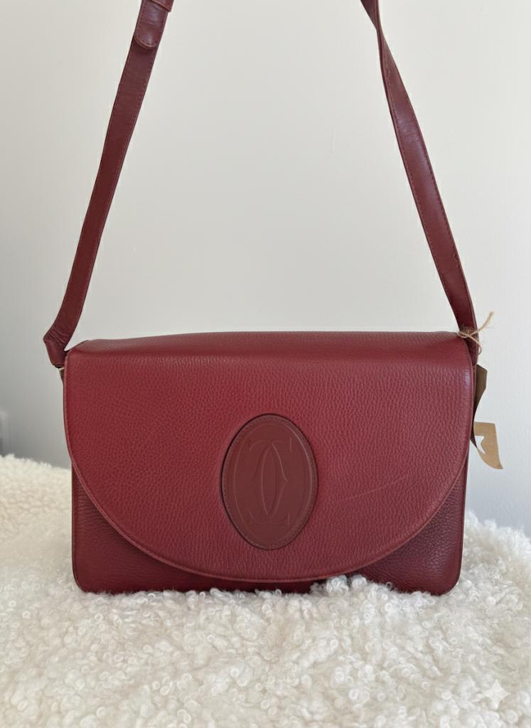 Vintage Must Be Cartierlarge leather shoulder bag in rich burgundy. Features a classic oval emblem detail on the front flap and an adjustable strap. Beautiful condition for its age . A rare and elegant find for collectors or vintage lovers. £130.00